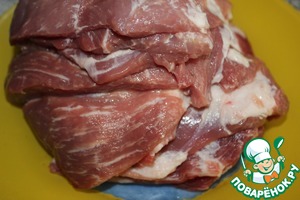 Нарезать мясо порционными кусками толщиной 1-1,5 см.