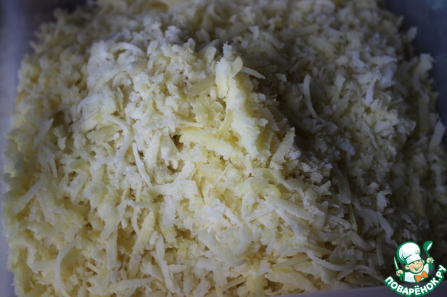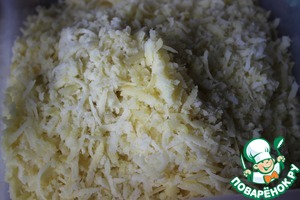 Сваренный в мундире, полностью остывший картофель натереть на крупной терке. Посолить, поперчить.
