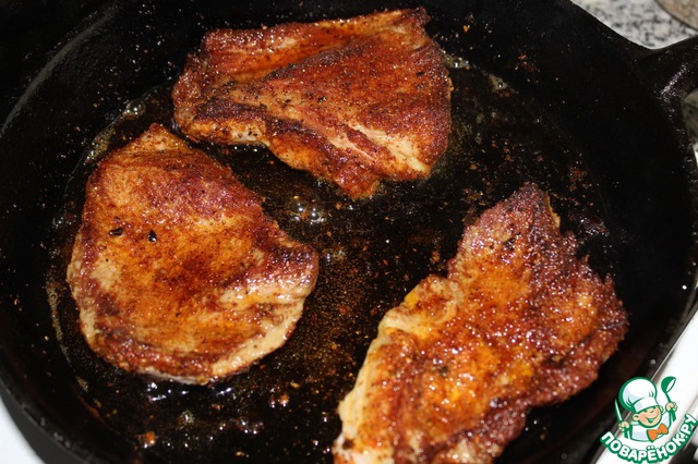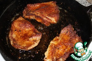 Мясо обвалять в смеси специй и соли и обжарить с 2 сторон до румяной корочки.