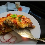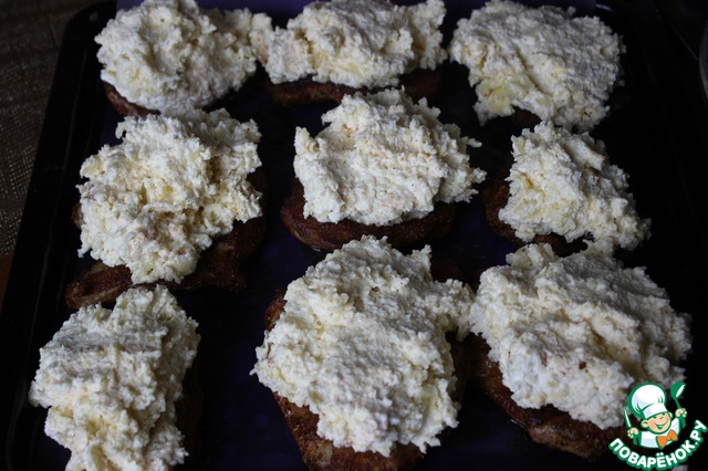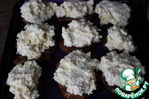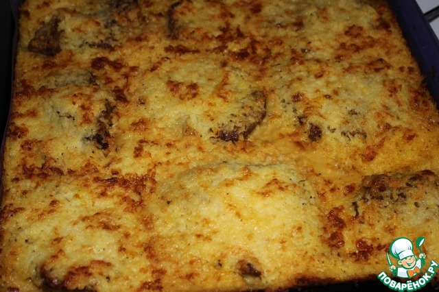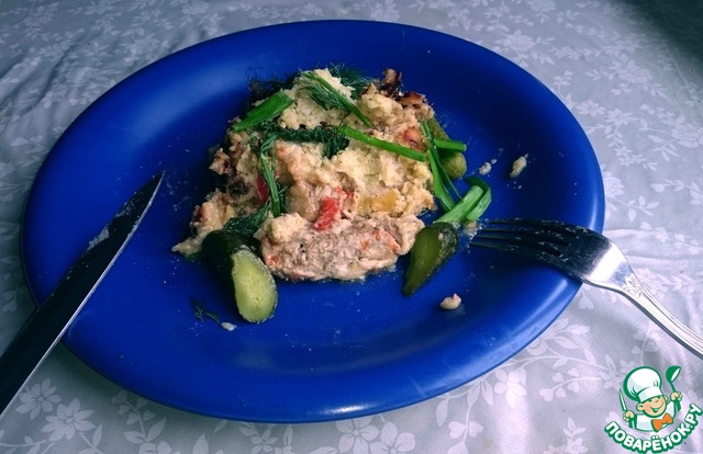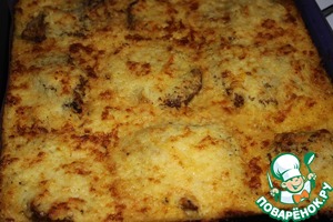 На смазанный растительным маслом противень выкладываем мясо. Картофельную массу разложить на куски мяса.