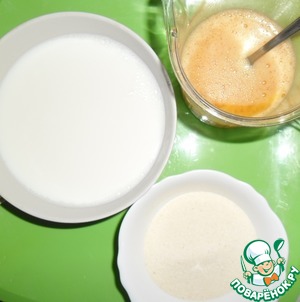 Прежде всего разведём в тёплой воде дрожжи + 1 ч. л. сахара + 1 ст. л. муки. Хорошо размешать и поставить в тёплое место. Яйца заранее вынуть из холодильника. Все продукты должны быть комнатной t.