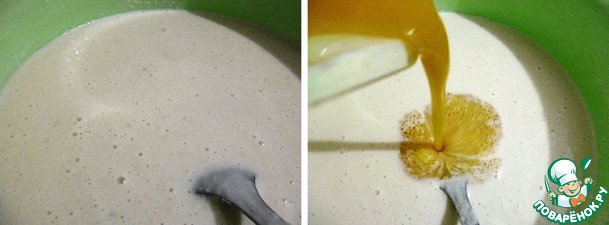 Через час тесто подошло, стало пышным, пенистым.