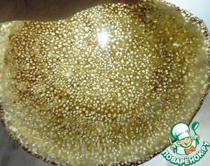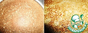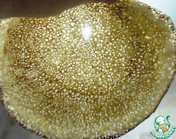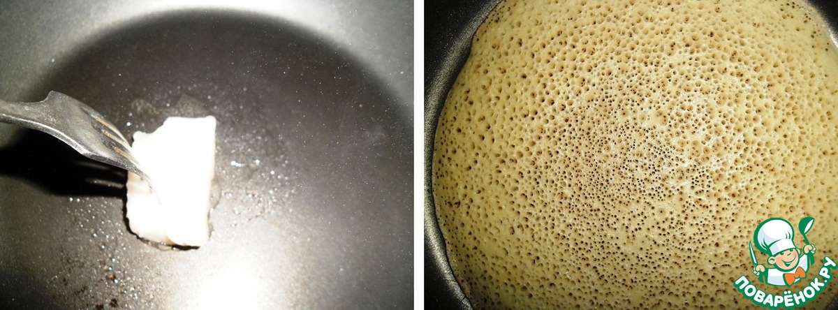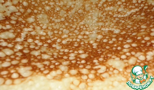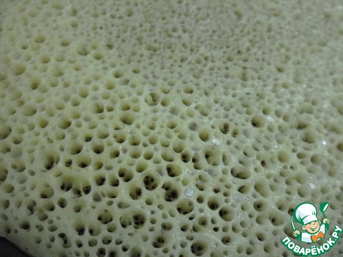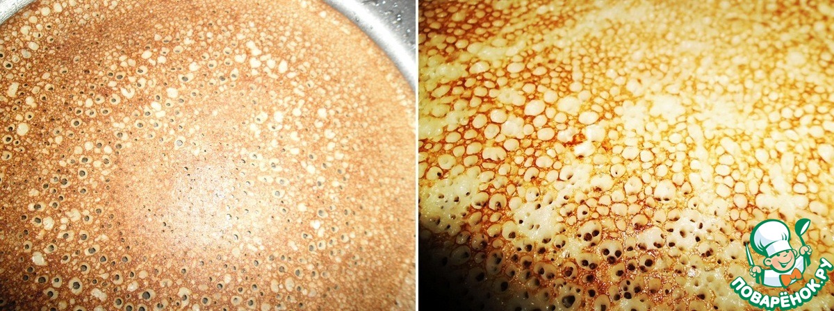 Тесто невероятно воздушное и пористое, через дырочки видно дно сковородки.