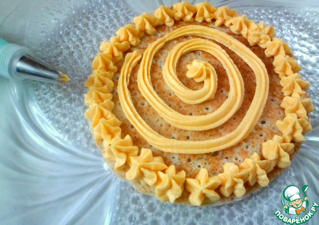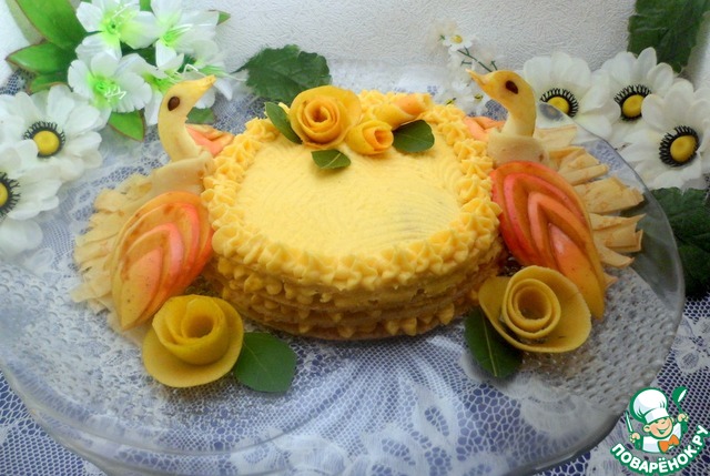 Тортик делаем не высокий, в четыре блина. Это за счет лебедей, чтоб они удобно "расселись". Смазать каждый блин кремом и уложить друг на друга.