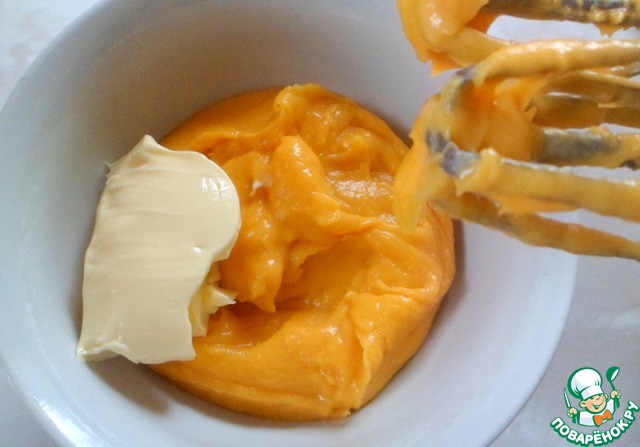 Приготовить тыквенный крем. Перемешать сразу в миске для микро: тыквенное пюре, сахар, яйцо, муку, чтоб не было комочков. Ставим в микро на 1,5 минуты, вынуть -тщательно перемешать венчиком. Затем ставим еще на минуту, вынуть, опять перемешать. Если крем загустел на этом этапе, то больше не ставить в микро. Накрыть пленкой в контакт и остудить. Мощность моей микроволновки 750вт. Вы рассчитывайте на мощность своей. Остывший крем взбить миксером, в два -три этапа добавить мягкое сливочное масло и взбивать на маленьких оборотах, не долго. Добавить ванилин, перемешать еще несколько секунд.