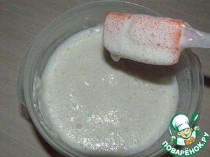 Добавить подошедшие дрожжи и муку. Отставить в теплое место на час. Накрыть полотенцем или пленкой.