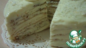 Собираю в форме, застелила борта пищевой пленкой, чередую блинчик с кремом.
