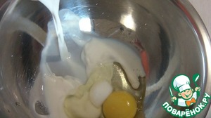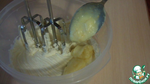 А затем берем творожный сыр, (у меня маскарпоне) взбиваем до пышности и по ложке добавляем наш остывший заварной крем. Продолжаем взбивать. Заварная основа у меня ушла на половину. -