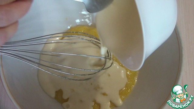 Для начала смешаем желтки с сахаром, а крахмал с апельсиновым соком (так мы избежим комочков). А затем соединим обе массы. Добавляем цедру апельсина. Хорошо перемешиваем!