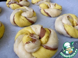 • Нарезаем тесто на полоски. Скручиваем их спиралью и сворачиваем в узелок. Дадим плюшкам немного расстояться. Смажем верх яйцом (сметаной, молоком).