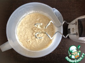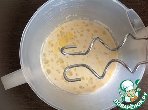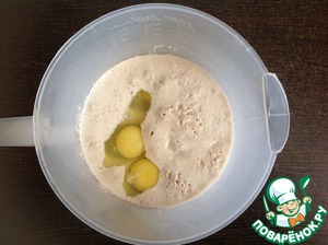 • В чашу миксера вылить закваску, добавить оставшийся сахар и яйца.