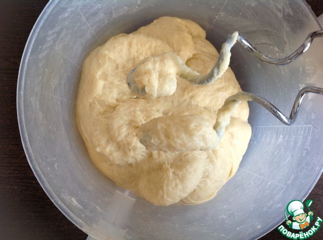 • Месить еще в течение 3 минут. Тесто будет липким, но должно легко соскребаться со стенок чаши. Миксер убрать и руками сформировать шар.