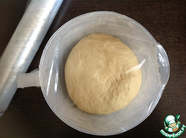 • Накрыть полиэтиленовой пленкой. Дальше возможны два варианта. Либо тесто отправляем в теплое место для подъема, примерно 1,5-2 часа, либо убираем в холодильнике на ночь на 8-12 часов (если пончики нужны на завтрак).