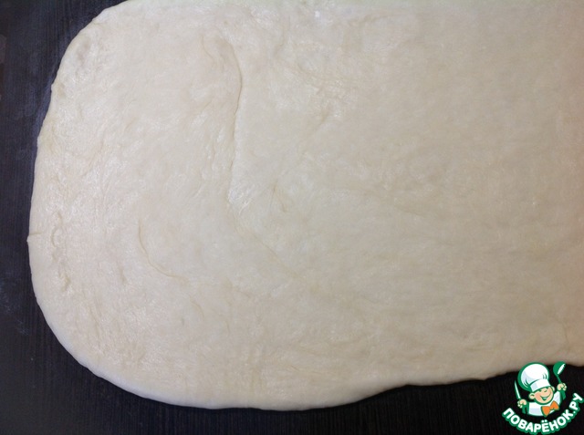• На посыпанной мукой (или смазанной растительным маслом) поверхности раскатать тесто толщиной около 1-1,3 см.
