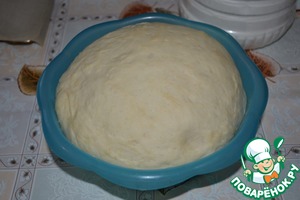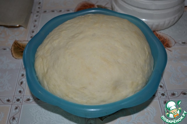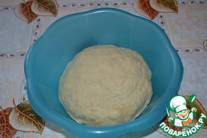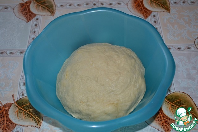 Муку я измеряла 200-граммовым стаканом. Влить растительное масло и хорошо вбить его в тесто. Оно должно быть мягким, эластичным и не липнуть к рукам. Накрыть полотенцем посуду с тестом и поставить в тёплое место на 1,5 часа для подъёма.