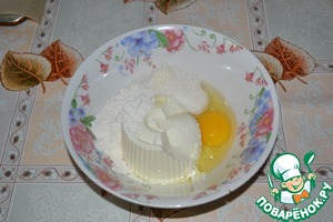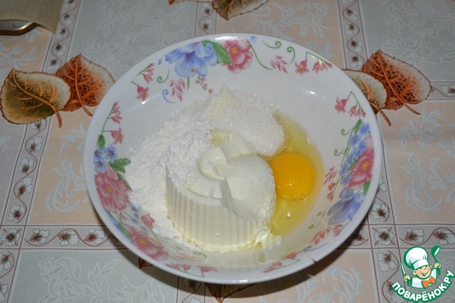 Пока тесто поднимается, приготовить начинку: выложить в глубокую чашу мягкий творожный сыр, добавить ванильный сахар, яйцо, сахар и муку.