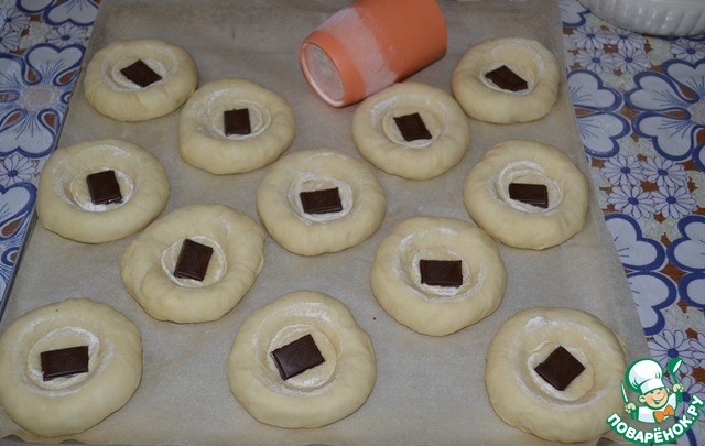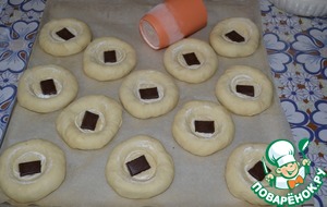 Выложить их на противень, застеленный бумагой для выпечки. Сделать углубление в серединке каждого шарика дном стакана, предварительно обмакнув его в муку. В каждое углубление положить по кусочку шоколада.