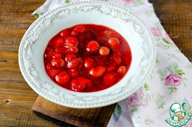 Клубнику положить в сотейник, добавить 70 г сахара и довести до кипения, затем добавить крахмал и варить до загустения.