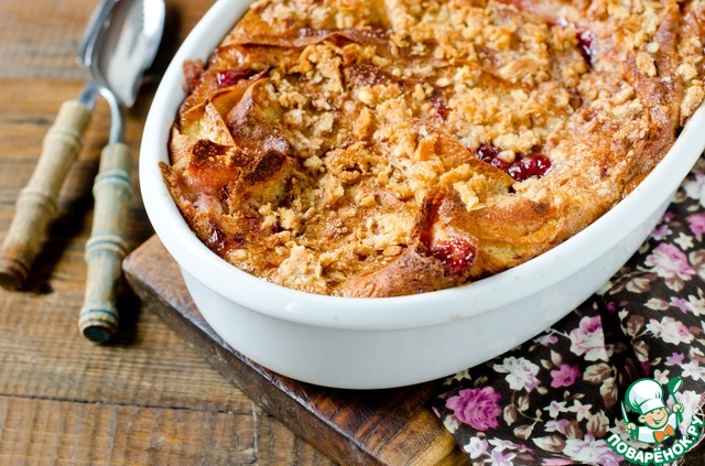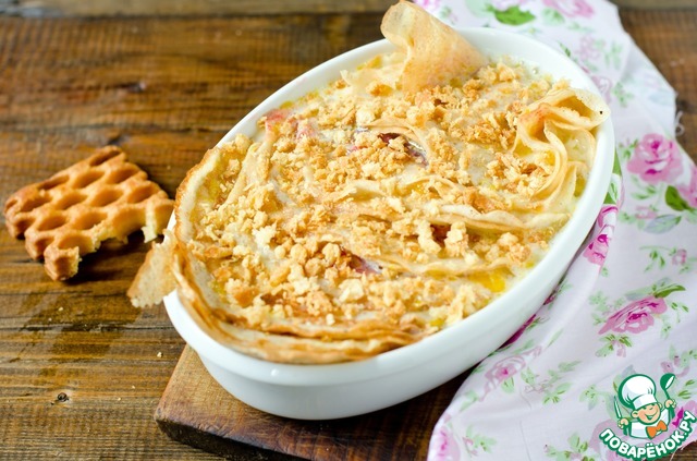 Для заливки смешать молоко, яйца и 70 г сахара до однородности. Залить блины полученной массой. Сверху раскрошить печенье, подойдет любое печенье, у меня было такое как на фото.