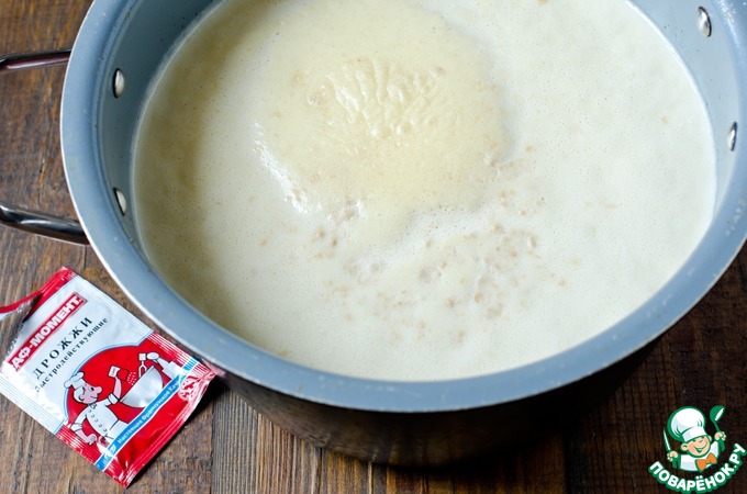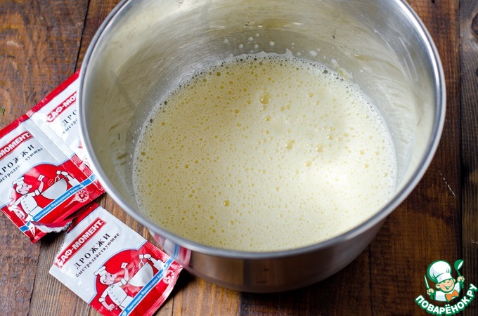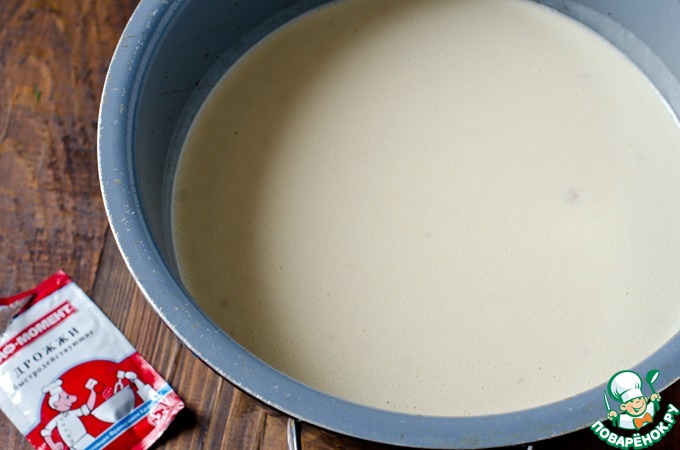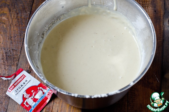 Продолжая взбивать добавляем молоко, растительное масло, дрожжи, соль и муку, взбить до однородности.