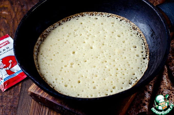 Сковороду смазываем растительным маслом (я это делаю кулинарной кисточкой), разогреваем. С помощью половника аккуратно зачерпываем тесто сверху (дрожжевую пенку) и выливаем в сковороду, даем ему равномерно растечься и поджариваем до румяности с обеих сторон.