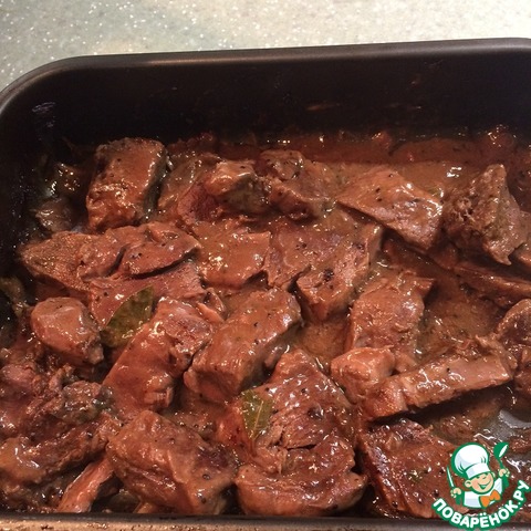 Выкладываем мясо в форму вместе с соусом-маринадом и в разогретую до 180 градусов духовочку.