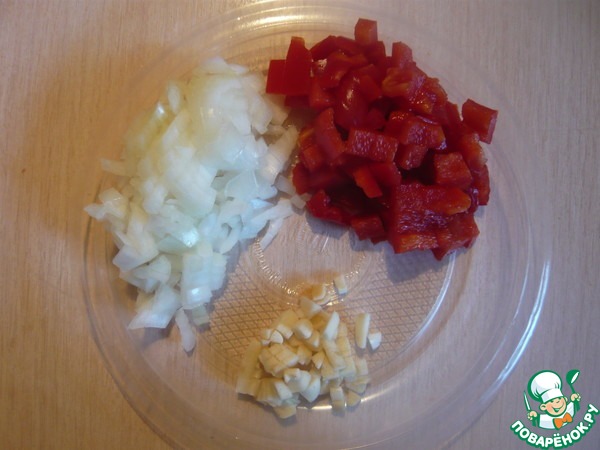 Перец болгарский, лук нарезаем кубиком. Чеснок измельчаем.