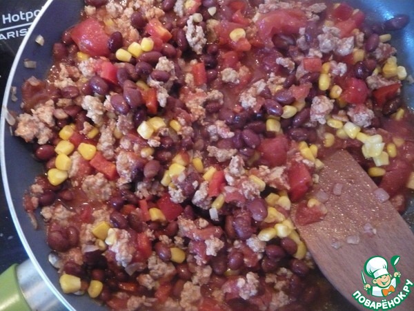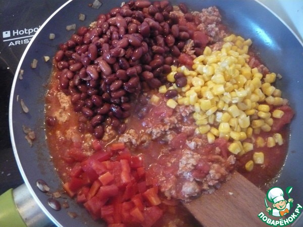 Добавляем вареную фасоль, кукурузу и кубики сладкого перца. Тушим 5 мин.