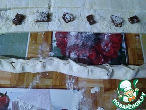 Слоёное тесто раскатать и порезать на полосы, на каждую полосу разложить маленькие кусочки шоколада и посыпать кокосовой стружкой. С лепить их в жгутики.