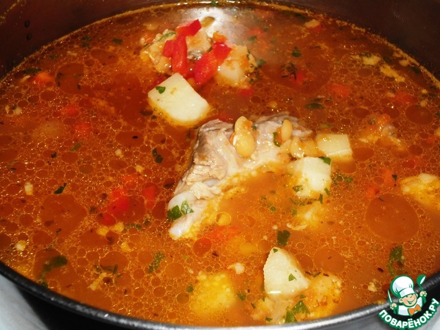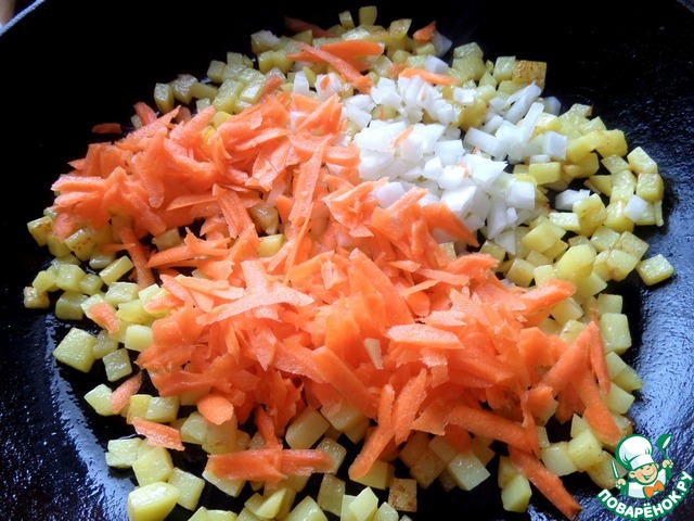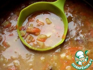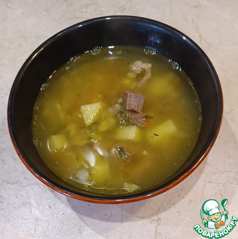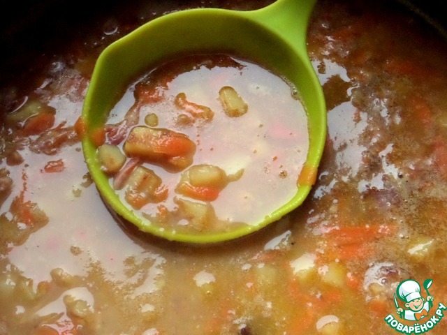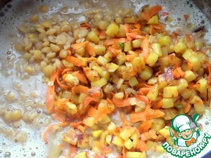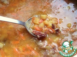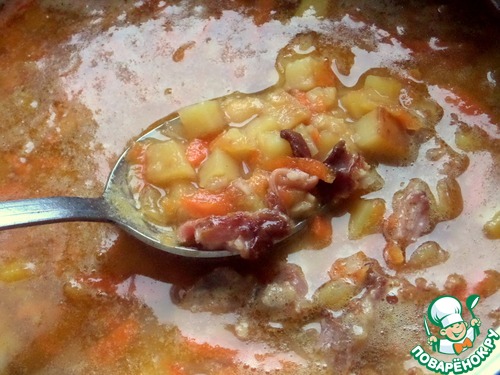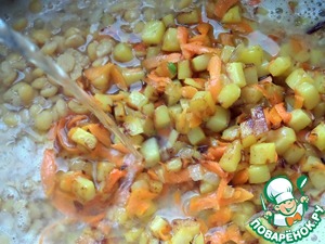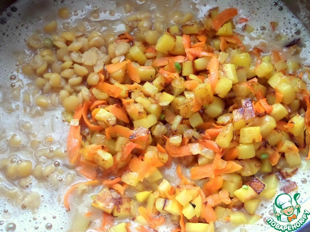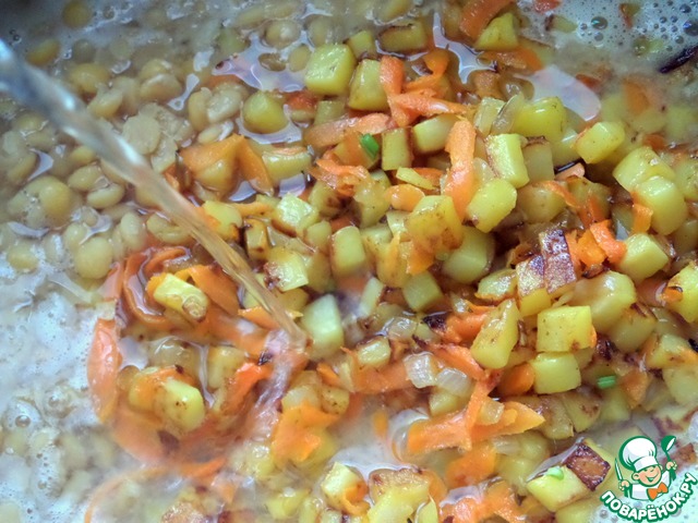 Отправить зажарку со сковороды и остатки гороха в кастрюлю.