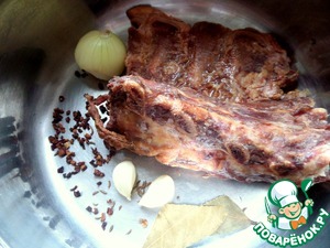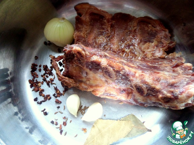 А пока готовим бульон. Взять косточку копчёную-рёбрышки, луковицу, лавровый лист, тмин, чеснок, соль и у меня сушёная морковь (она темнеет сильно при высыхании).