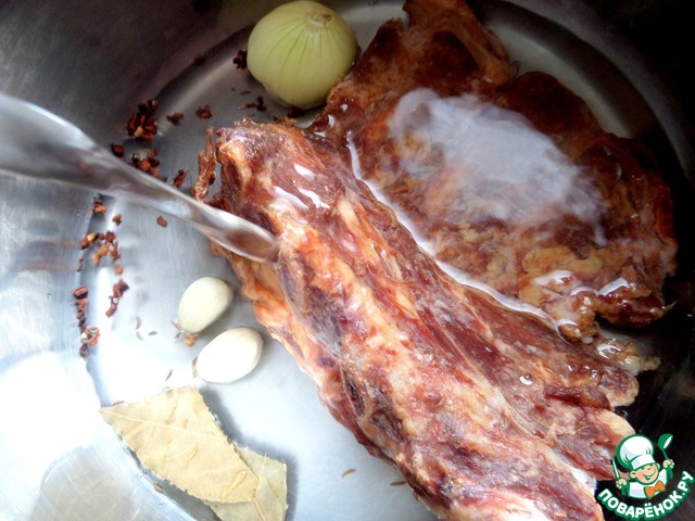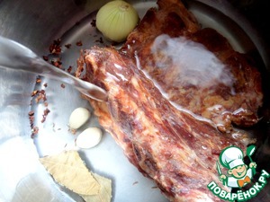 Залить литром холодной воды и поставить на огонь, снять пену при закипании.