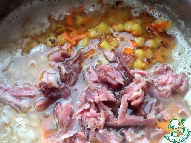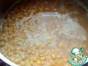Через час процедить, засыпать в бульон замоченный горох.