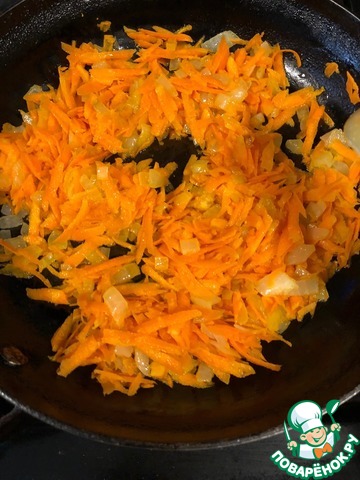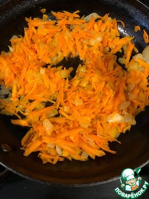 Тем временем готовим зажарку. Мелко режем лук, морковь натираем на терке. Лук и морковь слушка тушим на растительном масле до мягкости.