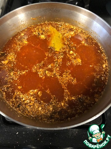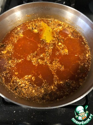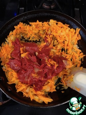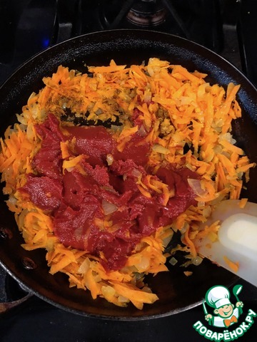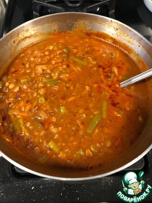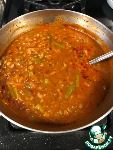 Затем добавляем хмели-сунели, перец и томатную пасту. Если хотите приготовить суп более острым, то здесь же добавьте измельченный красный перец. Перемешиваем.