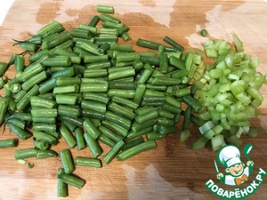 Черешковый сельдерей и зеленую стручковую фасоль нарезаем на небольшие кусочки.