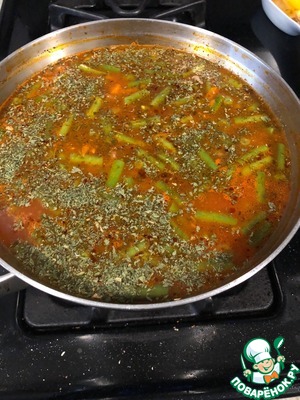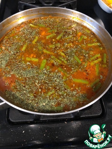 Добавляем к супу сельдерей, зеленую фасоль и петрушку (у меня сушеная измельченная) и варим до готовности фасоли, около 10 минут.