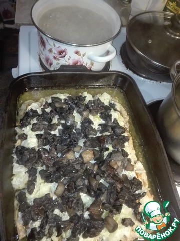 Когда грибочки подсушились. Выкладываем сыр и снова отправляем снова в духовку на 20 мин.