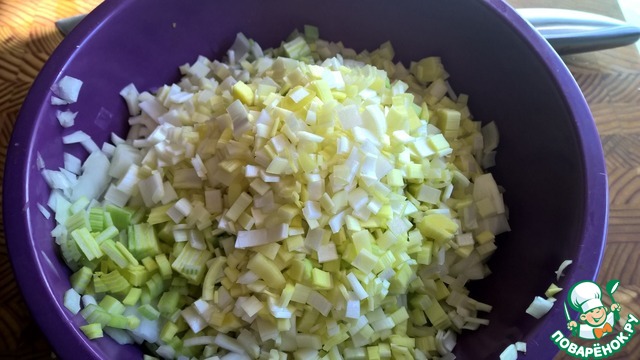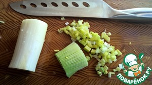 Лук порей нарезаем мелкими кусочками - около 2 - 3 мм. Для этого сначала разрезаем его вдоль пополам, затем делаем продольно-радиальные надрезы, оставляя кончик неразрезанным и режем поперек