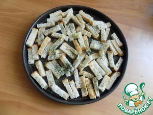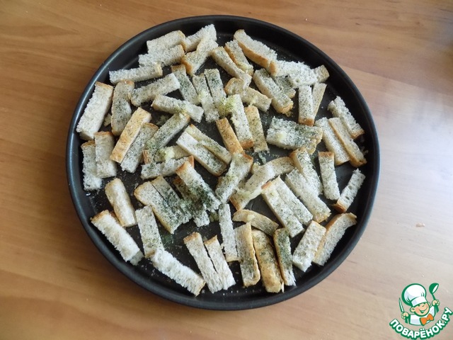 Для борща я сделала сухарики пшеничные в духовке. Порезала хлеб брусочками, выдавила в чесночницу зубчик чеснока, присыпала сухим укропом и солью и сбрызнула подсолнечным маслом. Отправила в духовку на 5-7 минут при т-180 С.