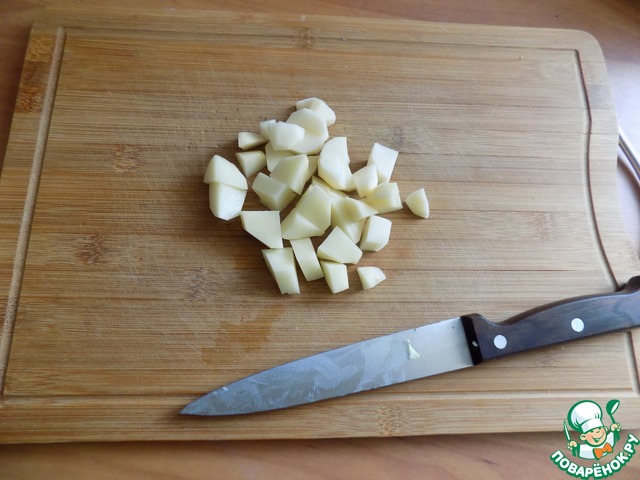 Минут через 5-картофель, порезанный небольшим кубиком. Опять накрыла крышкой.