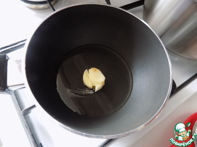 Параллельно, пока варилась фасоль, сделала заправку для борща. В сотейник налила масла 1 ст л и положила в него раздавленную дольку чеснока плоской стороной ножа.