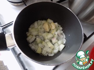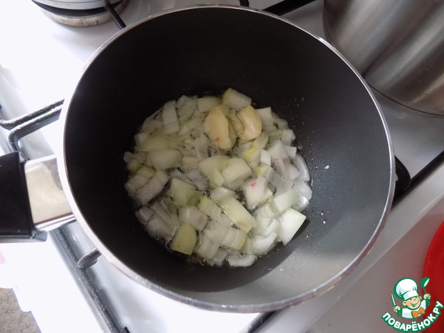 Через минуту, когда чеснок отдал свой аромат маслу, выложила лук мелко резанный и позолотила его пару минут.