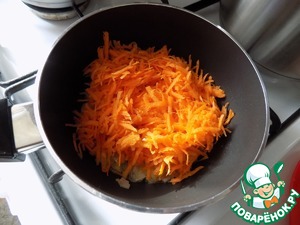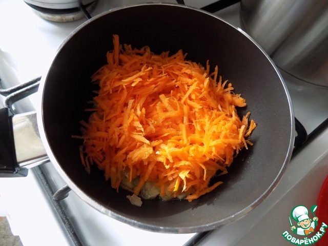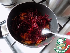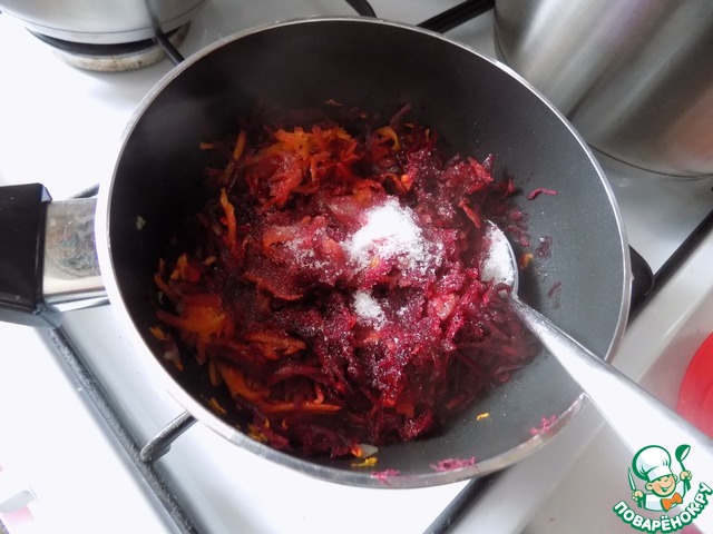 Перемешиваем и кладём сахар. Я положила одну ст л, вы можете положить по вкусу. Я люблю борщи кисло-сладкие. Опять всё перемешиваем и томим до готовности овощей минут 12-15, разбавив содержимое сотейника парой ложек бульона из кастрюли. Убавляем огонь на минимум и томим при закрытой крышке.