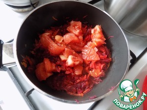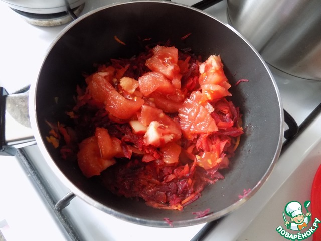 Далее выкладываем в сотейник томатную пасту 1 ст л и порезанный помидор кубиком, предварительно сняв с него кожицу. Кожицу снимаем, надсекая помидор крест-на-крест и окунув его в кипяток на минутку. Томим ещё с минуту и наливаем уксус яблочный или бальзамический, или просто 7%. Если борщ будут есть дети, то лучше добавить лимонный сок. Всё перемешиваем, томим ещё с минуту. Заправка для борща готова.