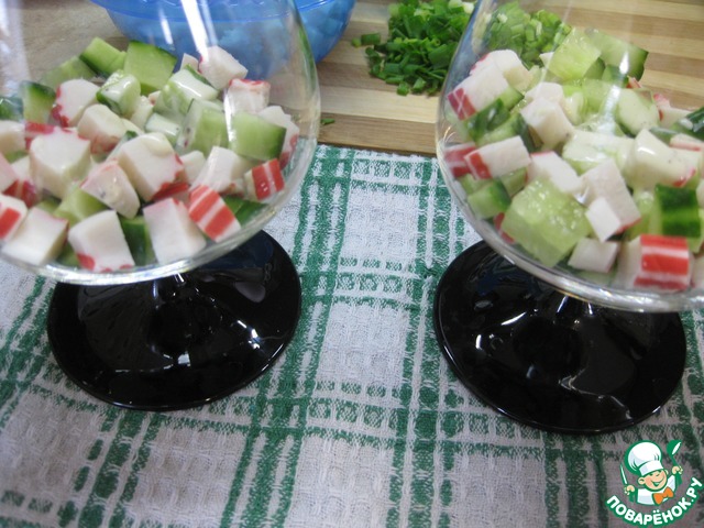 первым слоем выкладываем огурцы и крабовые палочки, сверху немного соуса, -