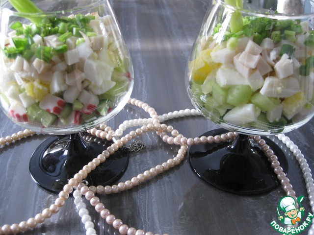 Затем яйца и сельдерей, снова соус, последний слой кальмары+соус и посыпаем зеленым луком.