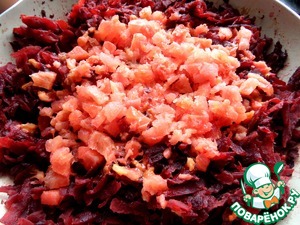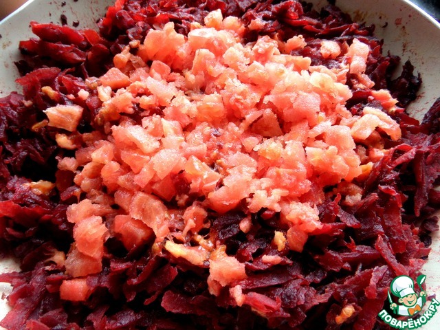 В тушёную свёклу покрошить томаты без кожицы или консервированные или томатную пасту.