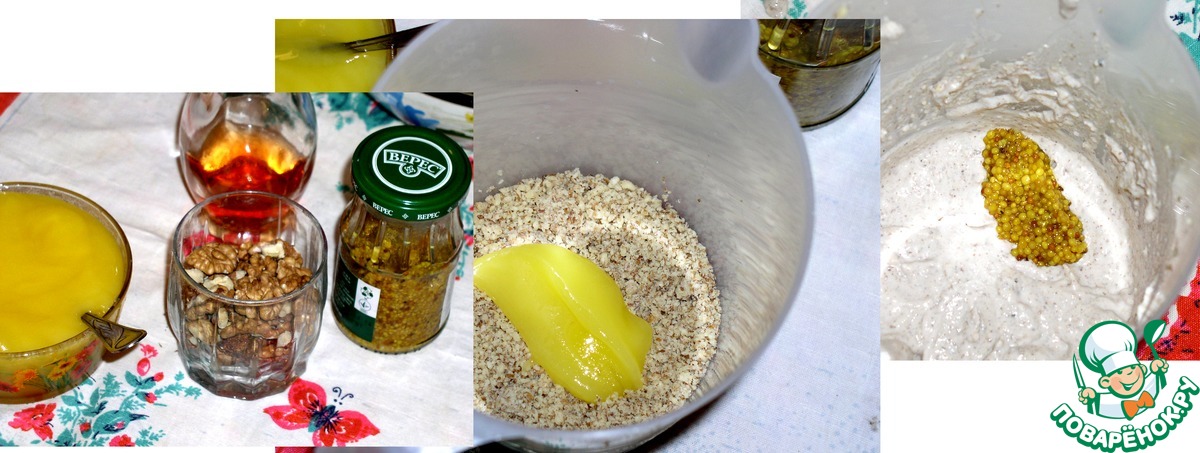 Мелкорубленые орехи сложить в чашу блендера. Мед растворить с соком лимона, водой и добавить к орехам.