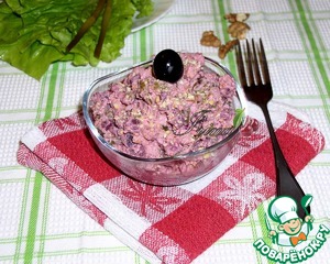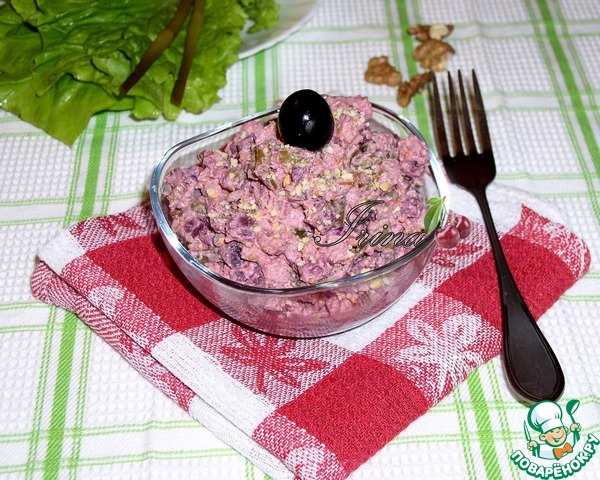 Украсить молотыми орехами, маслинами. Подавать с зеленью и ржаным хлебом. Салат из маринованной черемши в ореховом соусе готов!